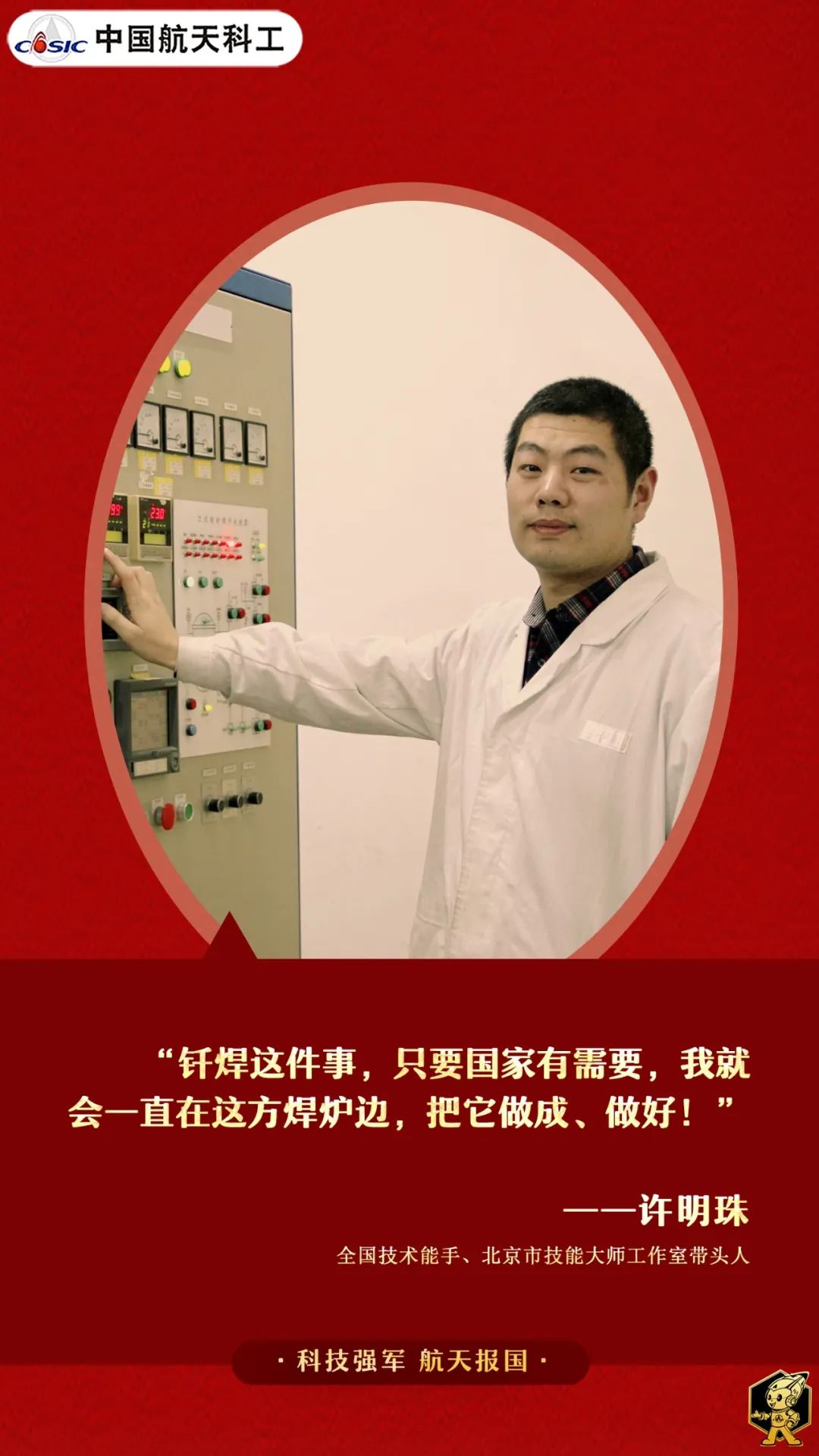 “國家有需要,我一定要做成、做好。”這是許明珠從業24年踐行的諾言,也是他對工匠精神的生動詮釋。從少年到匠人,從學徒到大師,許明珠用執著和堅韌打造釬焊產品,他深諳釬焊之道:將自己的青春“熔”進工藝并化身為最好的釬料,與祖國航天事業緊緊焊在一起。